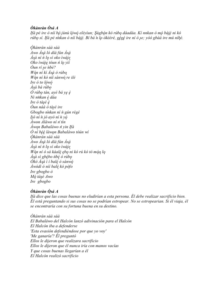 l termin la ejecucin del sacrificio y la vida lo agrad Sus cosas se pusieron buenas Sus cosas buenas no lo eludieron l tampoco extra sus cosas buenas Todo result ser un xito l estaba bailando y estaba regocijando Es el Babalwo que l estaba alabando El Babalwo estaba alabando If l dijo que era exactamente como su Babalwo haba dicho knrn s s El Babalwo del Halcn lanz adivinacin para el Halcn El Halcn iba a defenderse Le pidieron cuidar de la tierra y realizar el sacrificio La cabeza del Halcn sobre el sacrificio y lo realiz El picada de un Halcn nunca tocara la tierra y perdera El Cometa nunca tocara la tierra y regresara con manos vacas Todas las cosas buenas No eluda al Babalwo Todas las cosas buenas knrn s B ' ' If p elyun n k n kker. knrn sl ko skta ' Awo Ok l 'd' fn Ok ' ' ' Ok n somo Onre 'Snbe ' ' n k' Ok rbo ' Wn ' ' Wn n y' mo gb 'ni ' '' Enkan n gb ik ' ' ' knrn sl ko skta ' ' 'fn Aso ' Awo Aso l d ' '' Aso n 'somo Onre Snbe '' ' Wn n k' Aso rbo ' n y mo gb' ni '' Wn ' '' Enkan n gb ik ' ' knrn sl ko skta ' ' '' Awo Il l d fn Il ' ' Il n somo Onre Snbe ' ' Wn n 'k Il rbo ' n rbo' ' Il ' ' Wn n won n gb iku won ' ye wn ' ' ' Ay ' k ' Won ' Emi wn gn ' da fn on ' N wn w 'n j n wn n y 'n yin won Babalwo' Wn '