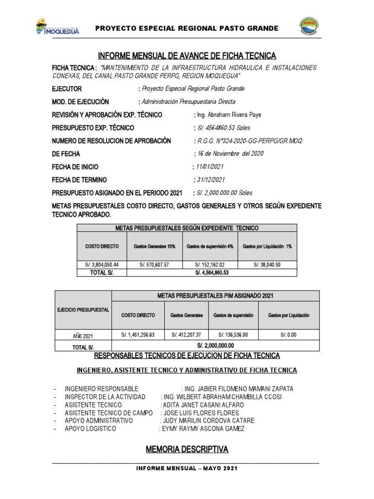 - La ficha técnica inicia sus actividades físicas el día 11 de Enero del 2021, con PRESUPUESTO EXP.