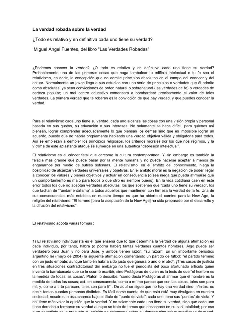 Podemos conocer la verdad? O todo es relativo y en definitiva cada uno tiene su verdad? Probablemente una de las primeras cosas que haga tambalear tu edificio intelectual o tu fe sea el relativismo, es decir, la concepcin que no admite principios absolutos en el campo del conocer y del actuar. Normalmente un joven llega a sus estudios con una serie de principios o verdades que l admite como absolutas, ya sean convicciones de orden natural o sobrenatural (las verdades de fe) o verdades de certeza popular; un mal centro educativo comenzar a bombardear precisamente el valor de tales verdades. La primera verdad que te robarn es la conviccin de que hay verdad, y que puedes conocer la verdad.