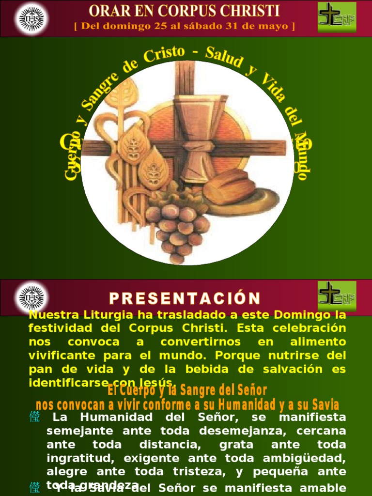 Le dedico unos 10 minutos. [ Sigo adelante ] (Si me ayuda, puedo decir varias veces la petición) [ Sigo adelante ] “Yo soy el pan vivo que ha bajado del cielo: el que come de este pan vivirá para siempre. Y el pan que Yo daré es mi carne para la vida del mundo” Señor, hace ya bastante tiempo que nos has enseñado a distinguir la diversidad de cosas que nos alimentan, que nos nutren, que mantienen En medio de en pie tantos nuestras beneficios, te existencias. has mostrado como comida divina, no sólo para que sepamos alimentar y nutrir nuestra anatomía, nuestra racionalidad y nuestra Cada afectividad, vez y con sino más que nos fuerza, convirtamos necesitamos en delalimento pan quevivificante nos hace para el mundo. inmortales más allá de toda mortalidad, saludables más allá de toda dolencia, alegres más allá de toda tristeza. Te necesitamos a Ti que eres Cuerpo y Sangre que nos hace vivir para siempre [ Y continúo la oración ] sumergidos, fraguando el corazón “Les aseguro que si no comen la carne del Hijo del Hombre y no beben su sangre no tienen vida en ustedes. El que come mi carne y bebe mi sangre tiene vida eterna, y Yo lo resucitaré en el último día. Tener vida en Ti pasa por esa mezcla misteriosa en la que se vive a una, la Cruz y la Resurrección. Nos has enseñado que para identificarnos contigo hemos de comer tu Carne y tu Sangre, es decir, Tu Humanidad, Señor, se alimentarnos de nos tu revela Humanidad semejante ante y de tu Savia. toda desemejanza, cercana ante toda distancia, grata ante toda ingratitud, exigente ante toda ambigüedad, alegre ante toda tristeza, y pequeña ante toda grandeza. Tu Savia, Señor, se nos revela amable ante toda dureza, sensata ante toda insensatez, accesible ante toda cerrazón, lúcida ante toda tiniebla, aguda ante toda simplonería, y sencilla ante toda [ Y continúo la oración ] prepotencia. “Mi carne es verdadera comida y mi sangre es verdadera bebida. El que come mi carne y bebe mi sangre habita en mí y Yo en él. El Padre que vive me ha enviado y Yo vivo por el Padre; del mismo modo, el que me come vivirá por mí. Tu Carne y tu Sangre son verdadera comida y bebida porque se hacen en nosotros una especie de energía vital que fluye inundándolo todo, haciendo que unos y otros nos llevemos mutuamente en Que el Señor el afecto habite y en la fe. en nosotros y nosotros en Él, hace que abandonemos el propio amor, el propio querer y el propio interés, y así pongamos en común lo que somos y lo que tenemos. [ Y continúo la oración ] “Este es el pan que ha bajado del cielo; no como el de sus padres, que lo comieron y murieron. El que come este pan vivirá para siempre” Nos enseñaste a valorar y a desear los múltiples y diversos alimentos que nos depara el mundo, para que en ellos no perdamos de vista aquel alimento que tiene la magia de darnos para Ese siempre alimentolaque vida.eres Tú, es quien sana toda nostalgia por lo pasado, quien equilibra toda avidez del presente, y quien sosiega toda ansiedad ante loEres venidero. Tú, Señor, quien nos atrae hacia Ti, dándonos definitivamente la vida. [ Y continúo la oración ] 1) A veces me 4) Vi tanta gente un pregunto ¿por qué yo? domingo de sol, y sólo me respondes me conmovió el latir de porque quiero. tantas vidas, Es un misterio grande y divisé tu brazo que nos llames, gigantesco, 2) asíEntonces tal comoredescubro somos a 5) Por eso tu altar luce y sé que sus historias una verdad: tu encuentro. vino y pan, recibías. mi vida, nuestra vida, son signo y homenaje es un tesoro. de la vida; Se trata entonces sólo misterio de ofrecerte y de ofrecerte, 3) Esto que soy, esto es recibirnos, ¿QUÉ TE DARÉ? ¿QUÉ TE con todo lo que te nuestro doy, amor, humanidad DAREMOS? que Cristo esto esto que que somos. somos, es lo diviniza. SI TODO, TODO, ES TU que te damos. REGALO. Tú no desprecias TE OFRECERÉ. TE nuestra vida humilde: OFRECEREMOS, ESTO QUE SOMOS, ESTO (Autor. Eduardo se trata de poner todo QUE SOY, ESTO TE DOY. Meana) en tus manos. [ Comienza el Cierre de la oración ] Para centrar la experiencia vivida en la Oración, respondo en forma sencilla las siguientes interrogantes: