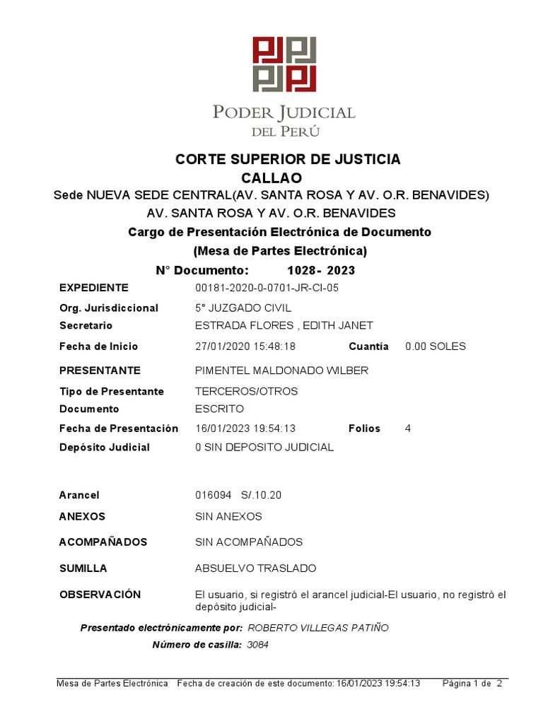Mesa de Partes Electrónica Fecha de creación de este documento: 16/01/2023 19:54:13 Página 1 de 2