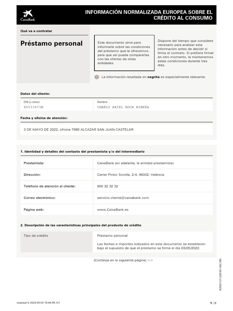 INFORMACIÓN NORMALIZADA EUROPEA SOBRE EL CRÉDITO AL CONSUMO | CaixaBank personal loan