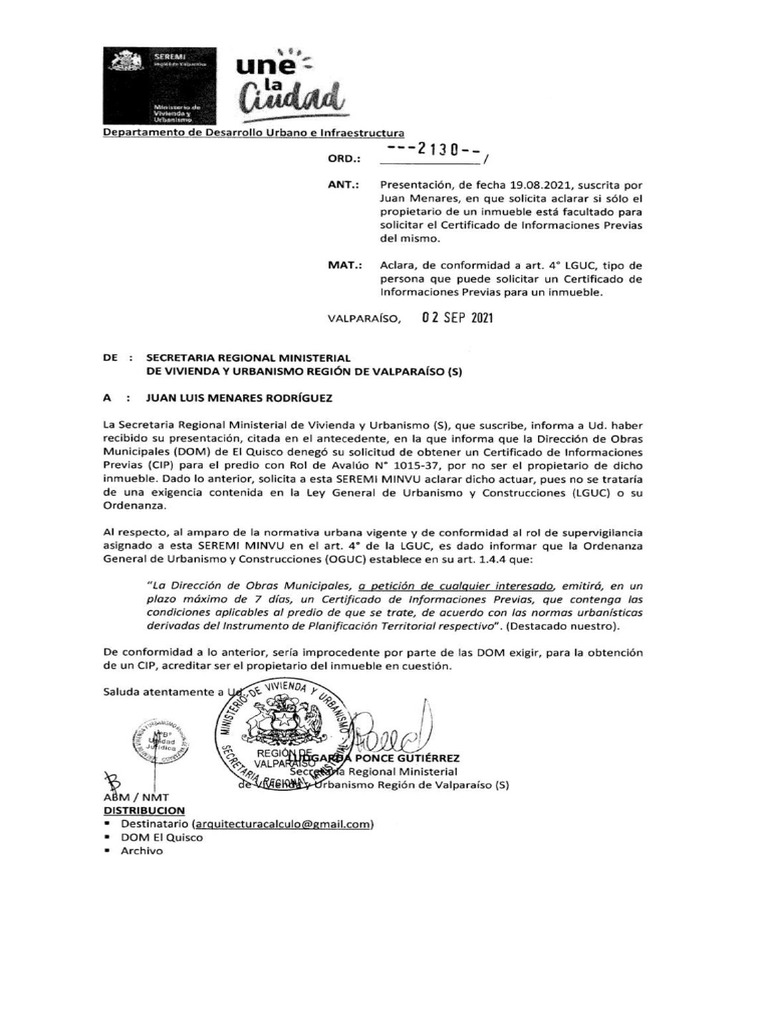 ‘Municipales (DOM) de El Quisco denegé su solicitud de obtener un Certificado de Informaciones