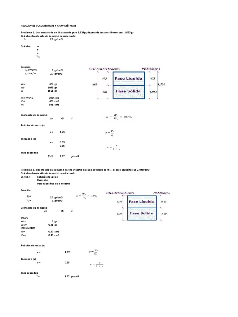 Problema 2. El contenido de humedad de una muestra de suelo saturado es 45%, el peso específico es 2.70gr/cm3