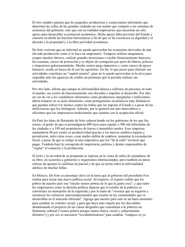 ciudades no son asunto que compete a los sistemas de asistencia del gobierno, sino que son en realidad empresarios que necesitan un solo apoyo para desarrollar su potencial econmico. Dicho apoyo debe provenir del Estado y consiste en abolir las barreras burocrticas a fin de que se les reconozca su dignidad y el derecho a la propiedad y a la libre actividad econmica. De Soto sostiene que un informal no puede aprovechar las economas derivadas de una elevada produccin como s lo hace un empresario. Tampoco utilizar maquinaria, ocupar muchos obreros, realizar grandes inversiones o recibir financiamiento bancario. En resumen, carece de proteccin y es objeto de corrupcin por parte de lderes, policas e inspectores gubernamentales. Mucho menos paga impuestos y como carece de apoyo bancario, acude en busca de l con los agiotistas. En fin, lo que posee para efectuar sus actividades constituye un "capital muerto", pues no lo puede aprovechar ni le sirve para respaldar ante las agencias de crdito un prstamo que le permita realizar sus actividades. Por otro lado, afirma que aunque la informalidad abarca a millones de personas en todo el mundo, sus costos de funcionamiento son elevados e impiden el desarrollo. Por ello, en vez de ver a los vendedores informales como productores marginales e ineficientes, deben tomarse en su justa dimensin: como protagonistas econmicos muy dinmicos que pueden sobrevivir incluso contra las trabas que les impone el Estado y a pesar de las ineficiencias que los distinguen. Adems, por lo general son ms innovadores y eficientes que los empresarios tradicionales que cuentan con la aceptacin oficial. En Per las ideas de Hernando de Soto calaron hondo en los gobiernos de los que fue asesor, al grado de que se promulgaron 400 leyes para regular a 300 mil informales de las ciudades y a 350 mil propietarios de tierras e inmuebles rurales. Esas empresas aumentaron 40 por ciento su productividad gracias a los nuevos cambios legales y permitieron, entre otras cosas, crear medio milln de empleos, aumentar la recaudacin fiscal, a pesar de que se redujo la tasa impositiva que los "de la calle" tuvieron que pagar. Tambin baj la corrupcin de inspectores, policas y dems responsables de "vigilar" el comercio y la produccin. El xito y la novedad de su propuesta se expresa en la venta de miles de ejemplares de su libro, en asesoras a gobiernos y organismos internacionales, pero tambin en duras crticas de quienes lo califican de parcial y de que su teora sobre la informalidad adolece de muchas fallas. En Mxico, De Soto es personaje clave en la tarea que el gobierno del presidente Fox realiza para trazar una nueva poltica social. Al respecto, el experto seala que los pobres de nuestro pas son "mucho menos pobres de lo que la gente cree", y que tanto los empresarios como la derecha poltica dejaron que el estudio de la pobreza se convirtiera en monopolio de la izquierda y por lo tanto de "visiones que se negaron a reconocer los esfuerzos microempresariales que existen en las comunidades que se desarrollan en el mercado informal". Agrega que nuestro pas est en un buen momento para cambiar su contrato social, y para que haya ms respeto por los desvalidos abandonando el prejuicio de las clases dirigentes que consideran a la pobreza un fenmeno cultural ("somos pobres porque somos tnica, racial y culturalmente distintos") y por eso es necesario "occidentalizarnos" para cambiar. Tampoco es ya