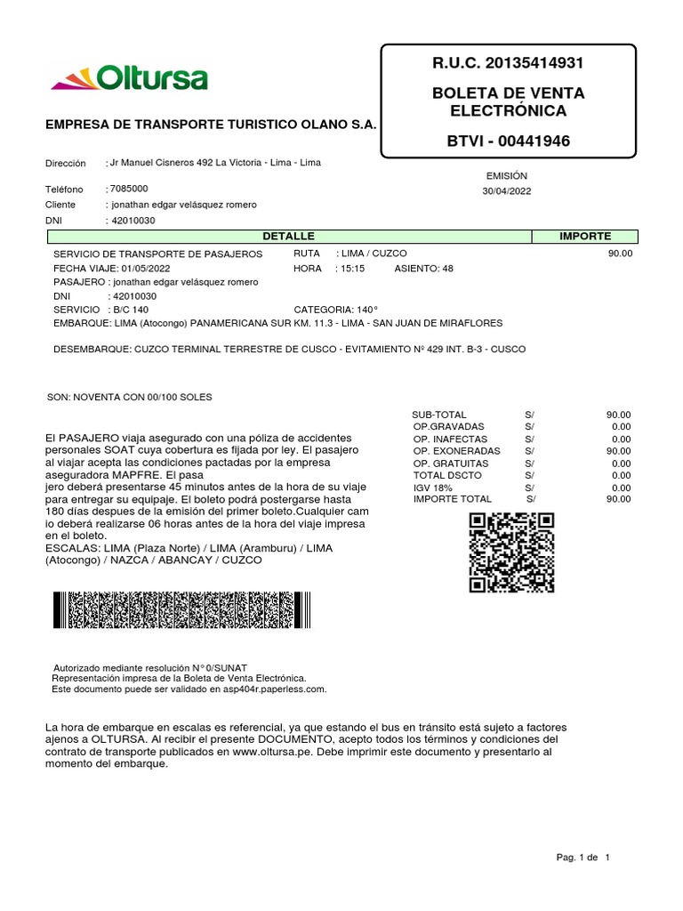 contrato de transporte publicados en www.oltursa.pe. Debe imprimir este documento y presentarlo al
