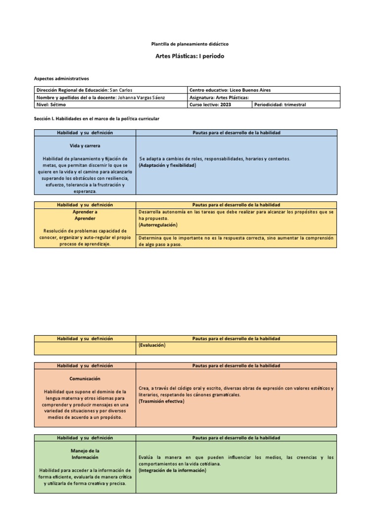 Nombre y apellidos del o la docente: Johanna Vargas Sáenz Asignatura: Artes Plásticas: