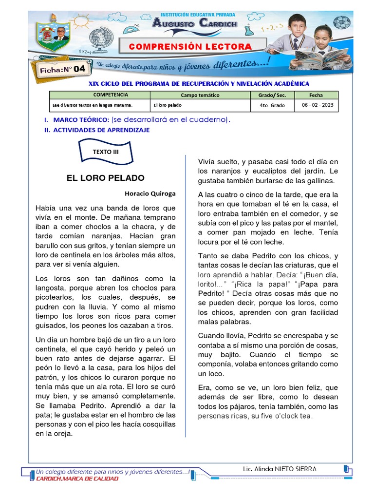 IEP “AUGUSTO CARDICH” COMPRENSIÓN LECTORA – 4TO. GRADO