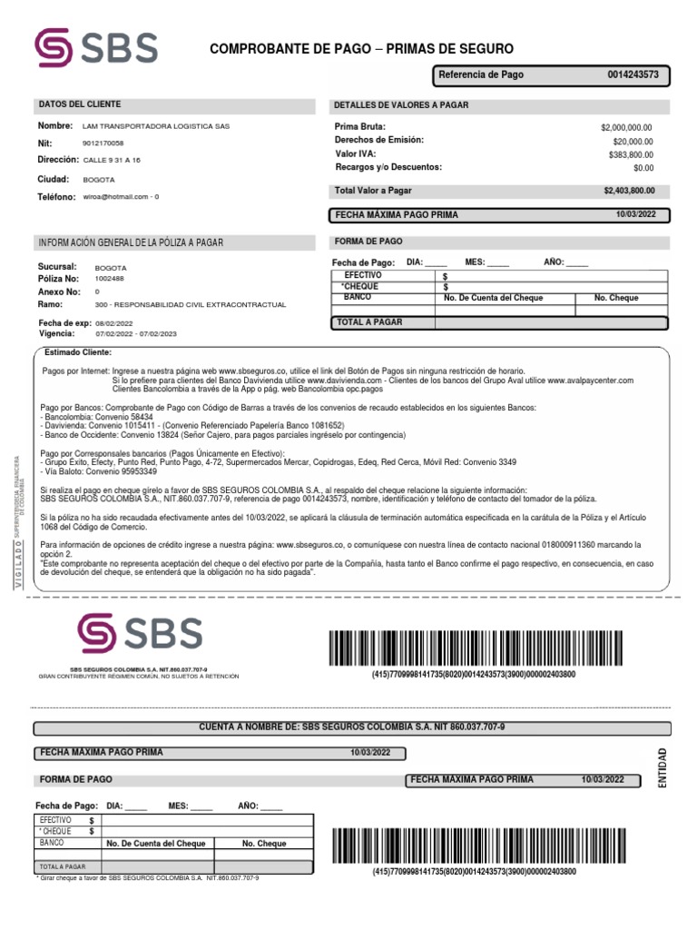 SBS SEGUROS COLOMBIA S.A., NIT.860.037.707-9, referencia de pago 0014243573, nombre, identificación y teléfono de contacto del tomador de la póliza.