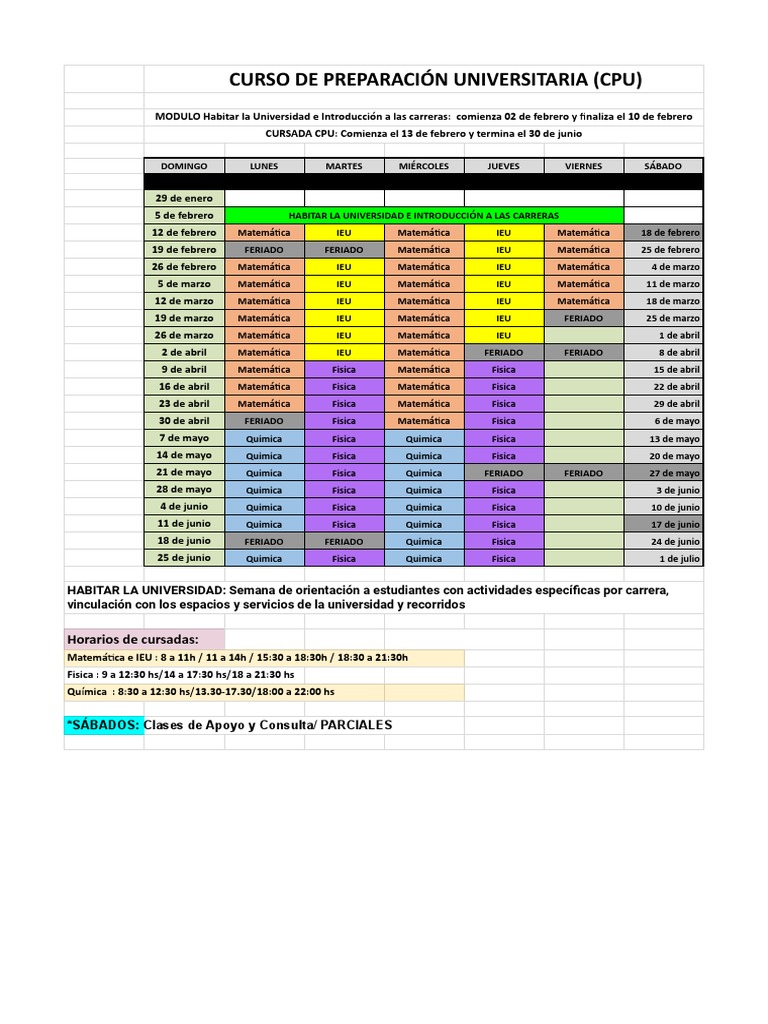 CURSADA CPU: Comienza el 13 de febrero y termina el 30 de junio