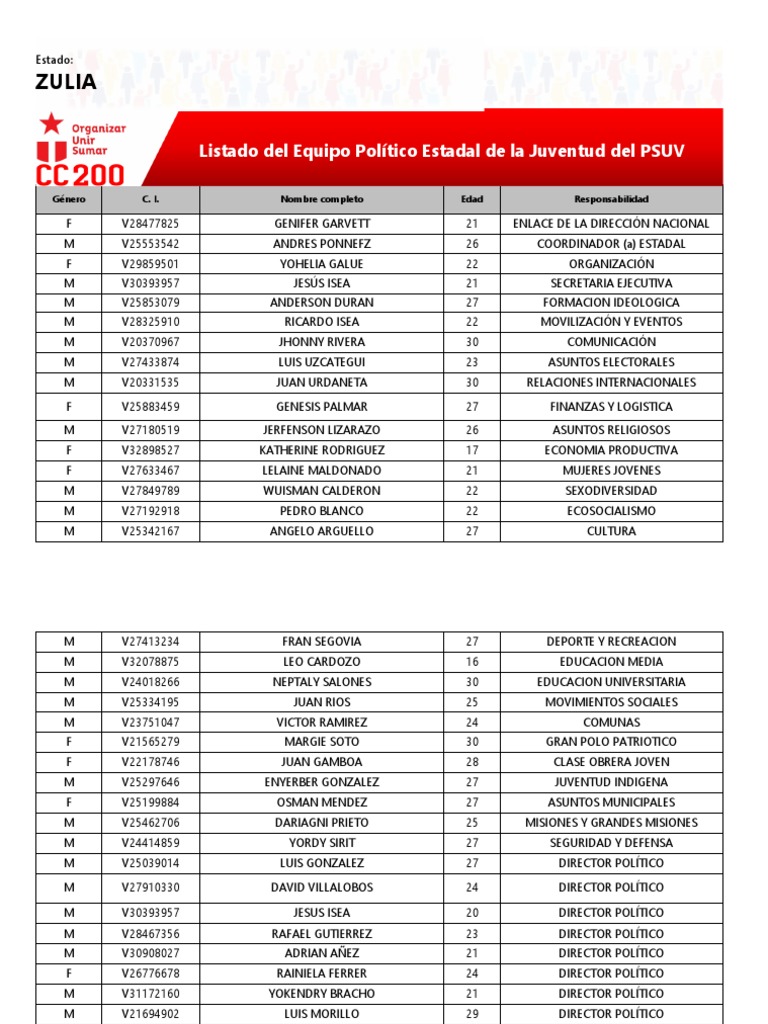 Listado del Equipo Político Estadal de la Juventud del PSUV