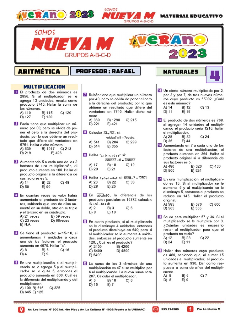 F En una multiplicación, si al multipli- M La suma de los 3 términos de una to aumenta en 930. Dar como res-