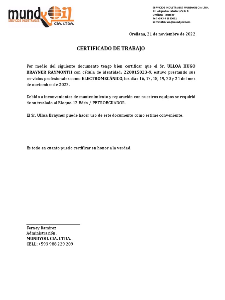 Por medio del siguiente documento tengo bien certificar que el Sr. ULLOA HUGO