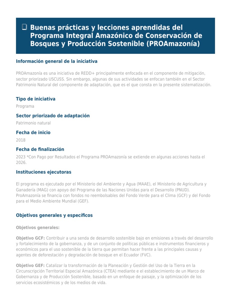 Buenas Prácticas Y Lecciones Aprendidas Del Programa Integral Amazónico de Conservación de Bosques Y Producción Sostenible (Proamazonía)