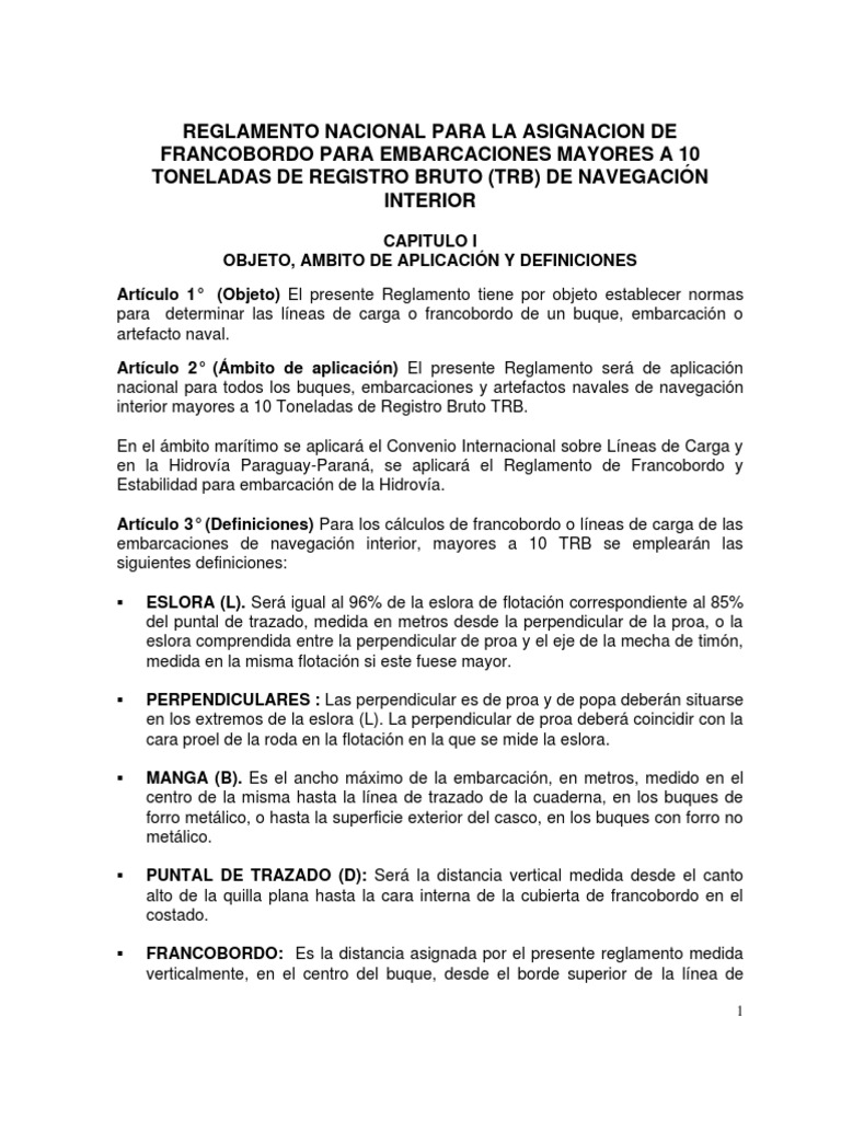 Artículo 3° (Definiciones) Para los cálculos de francobordo o líneas de carga de las
