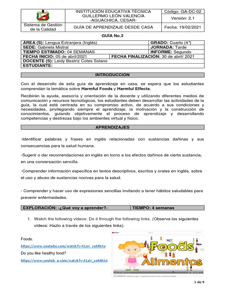 Consignar en el cuaderno de inglés la temática “Harmful foods”. A continuación: