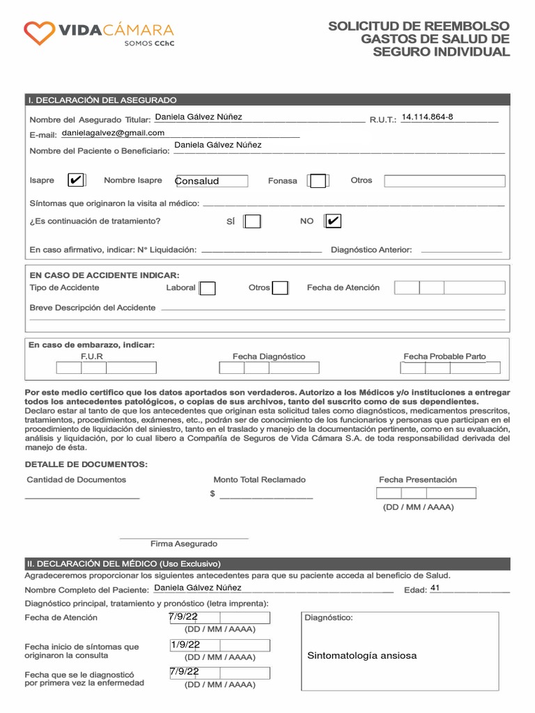 1. La "Solicitud de Reembolso Gastos de Salud" debe ser completada por el Asegurado, llenando el recuadro titulado