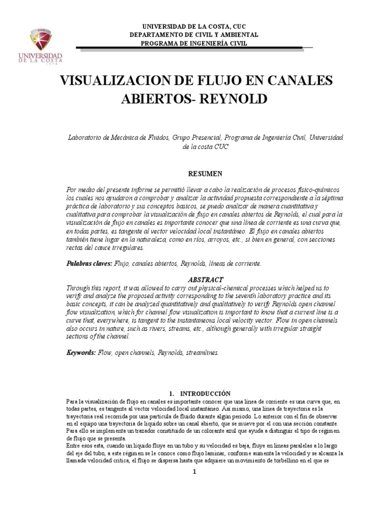 Palabras claves: Flujo, canales abiertos, Reynolds, líneas de corriente.