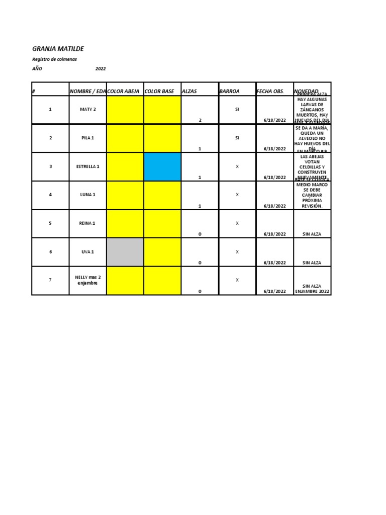 # NOMBRE / EDA COLOR ABEJA COLOR BASE ALZAS BARROA FECHA OBS. NOVEDAD