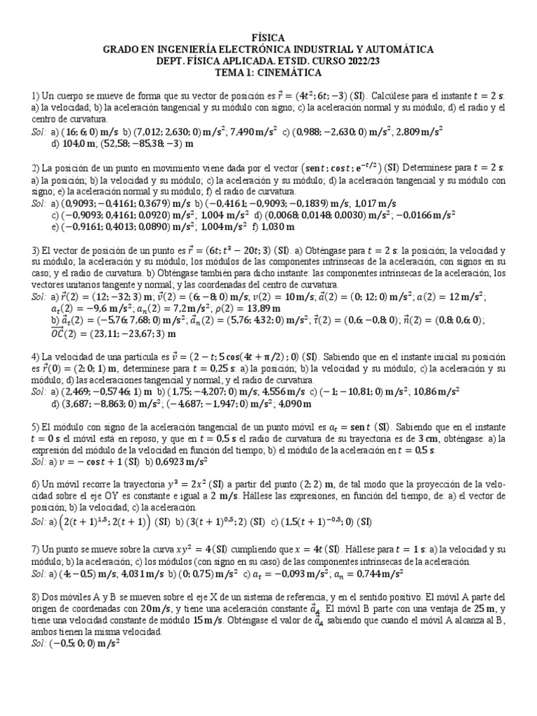 1) Un cuerpo se mueve de forma que su vector de posición es 𝑟𝑟⃗ = (4𝑡𝑡 2 ; 6𝑡𝑡; −3) (SI). Calcúlese para el instante 𝑡𝑡 = 2 s: