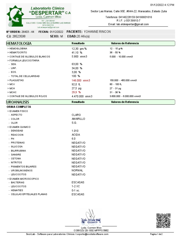 N° ORDEN: 26403 - 44 FECHA: 01/12/2022 PACIENTE: YOHANNE RINCON
