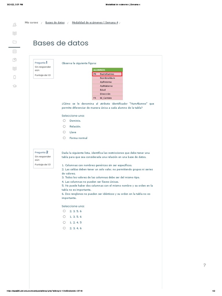 Mis cursos / Bases de datos / Modalidad de exámenes | Semana 4 /