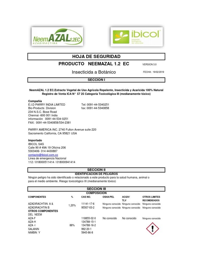Identificacion de Envío Insecticida a Base de Azadirachtin (Neem)