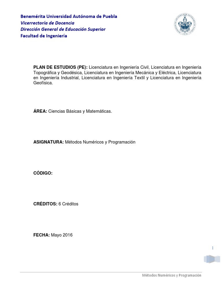 Nombre de la Asignatura: Métodos Numéricos y Programación