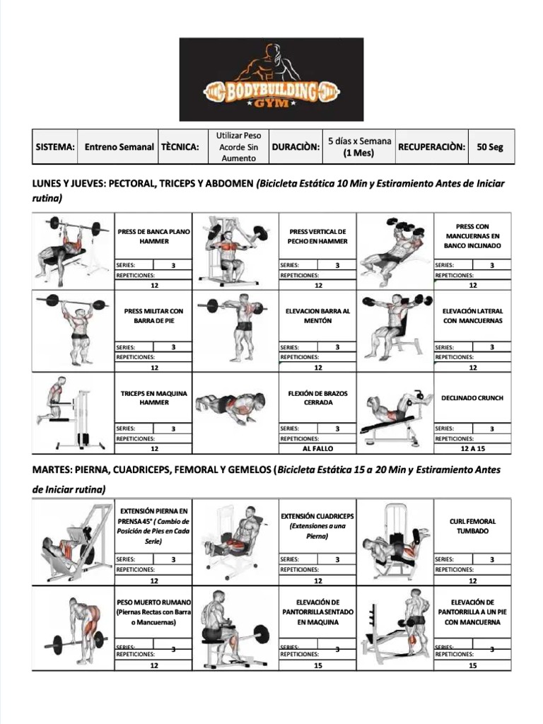 LUNES Y JUEVES: PECTORAL, TRICEPS Y ABDOMEN (Bicicleta Estática 10 Min y Estiramiento Antes de Iniciar