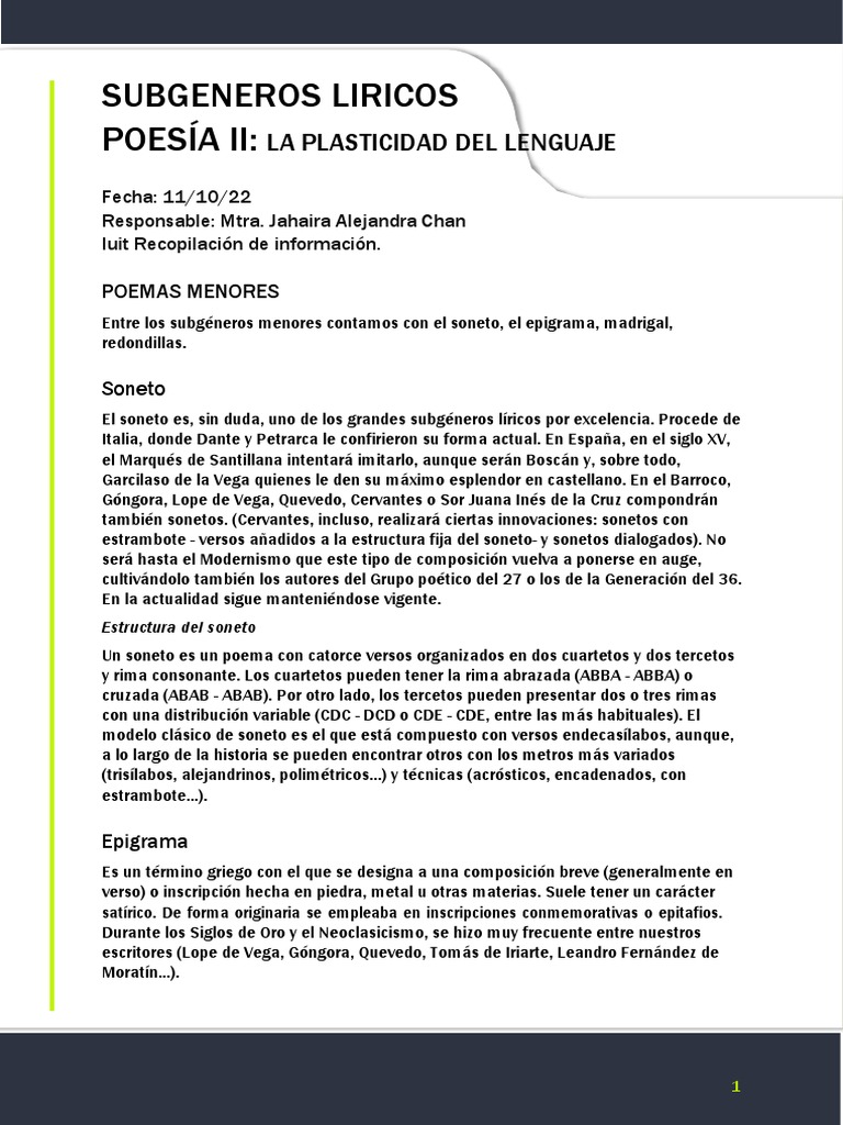 Geralt, L. (s.f) Los subgéneros líricos I. Los subgéneros liricos cultos. Recuperado de: