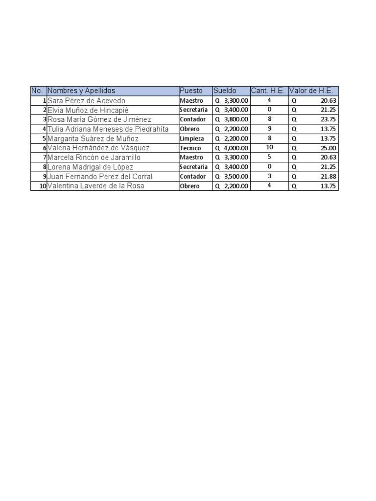 No. Nombres y Apellidos Puesto Sueldo Cant. H.E. Valor de H.E.