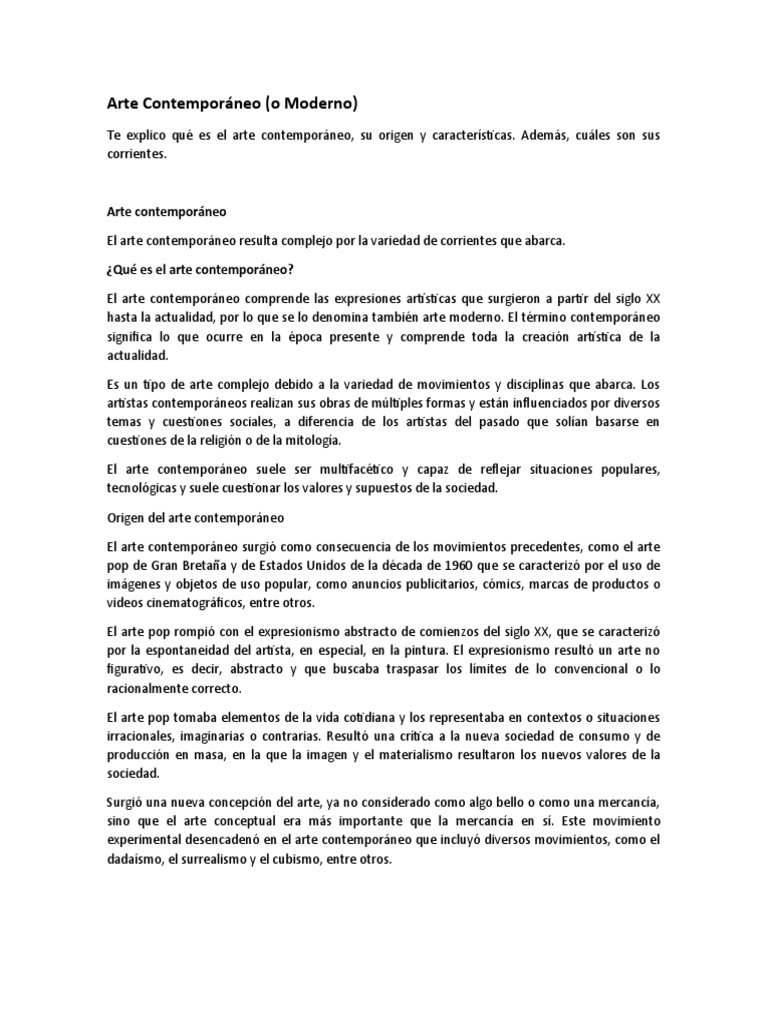 El arte contemporáneo surgió como consecuencia de los movimientos precedentes, como el arte