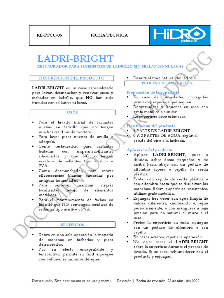 o HIDROWET en pisos. ▪ No utilizar LADRI-BRIGHT para