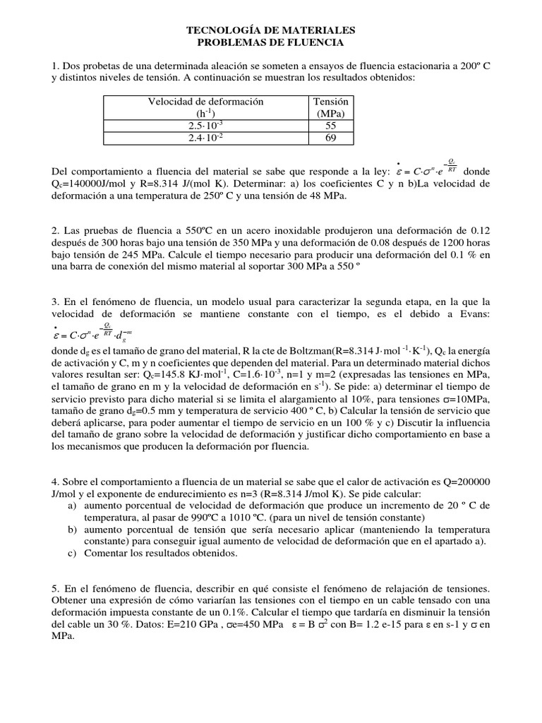 4. Sobre el comportamiento a fluencia de un material se sabe que el calor de activación es Q=200000