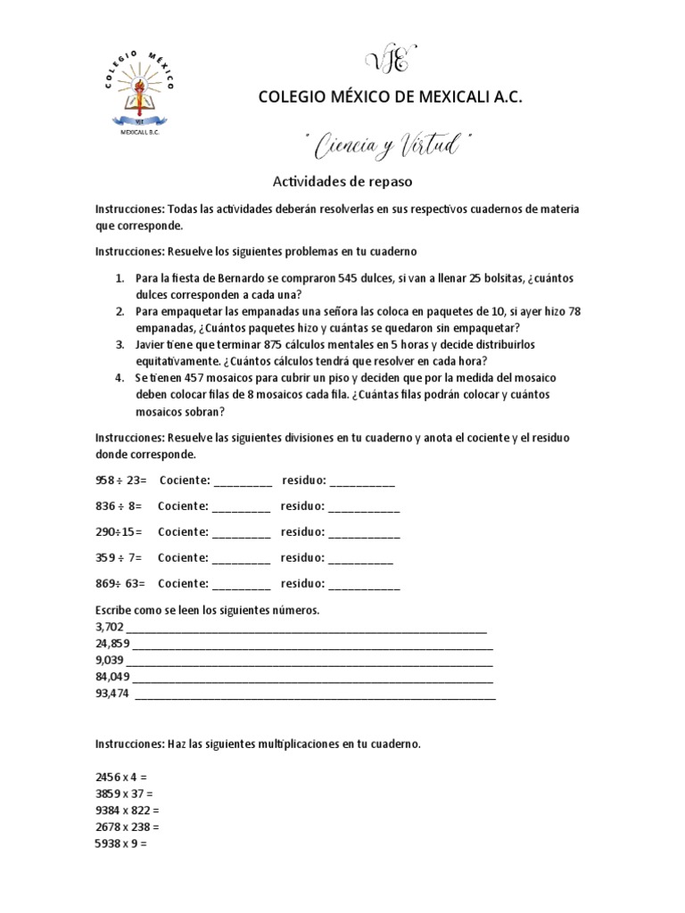 Instrucciones: Resuelve las siguientes divisiones en tu cuaderno y anota el cociente y el residuo