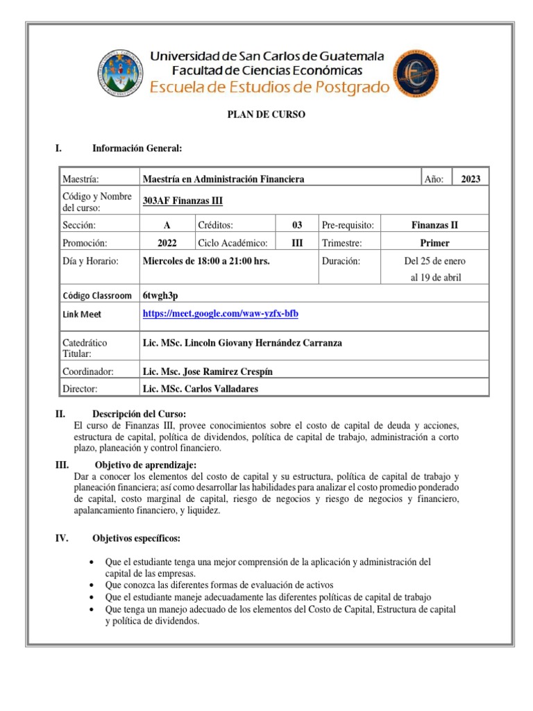 Sección: A Créditos: 03 Pre-requisito: Finanzas II
