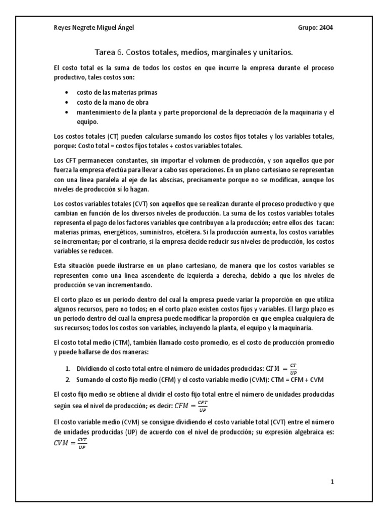 Tarea 6. Costos totales, medios, marginales y unitarios.