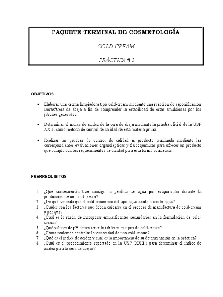 3. ¿Cuáles son los factores que deben cuidarse en el proceso de manufactura de cold-cream