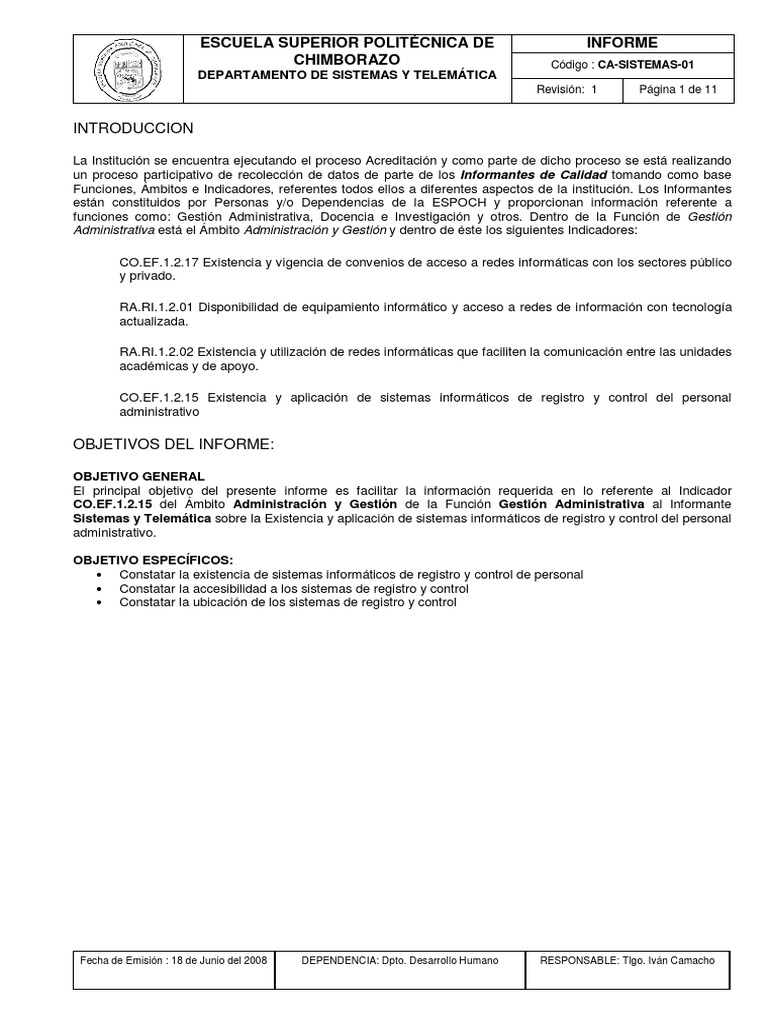 Fecha de Emisión : 18 de Junio del 2008 DEPENDENCIA: Dpto. Desarrollo Humano RESPONSABLE: Tlgo. Iván Camacho
