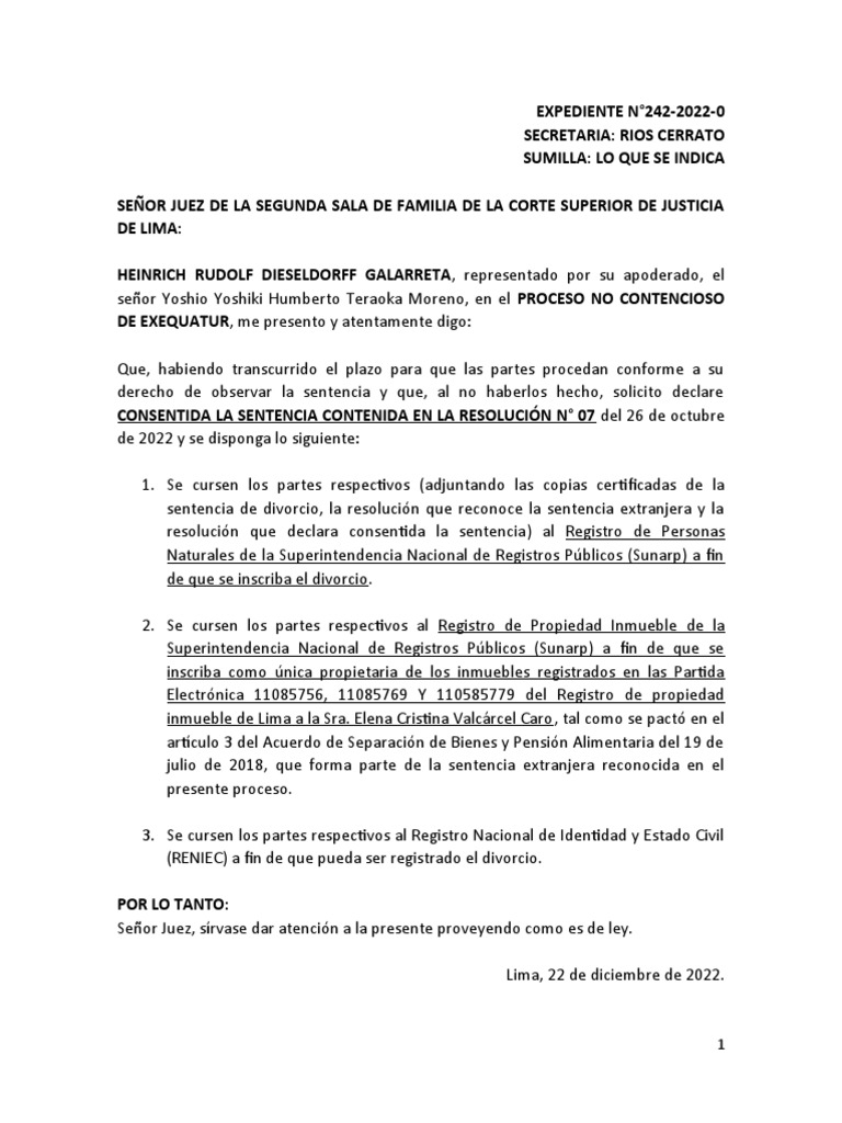 (RENIEC) a fin de que pueda ser registrado el divorcio.