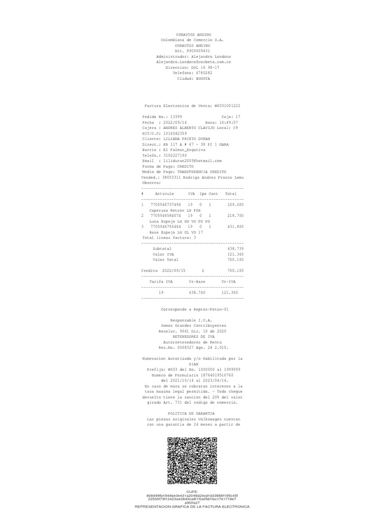 Factura Electronica de Venta: W6031001222