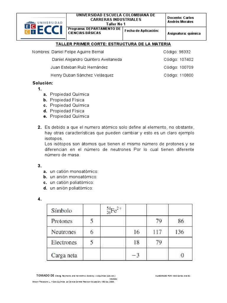 TALLER PRIMER CORTE: ESTRUCTURA DE LA MATERIA