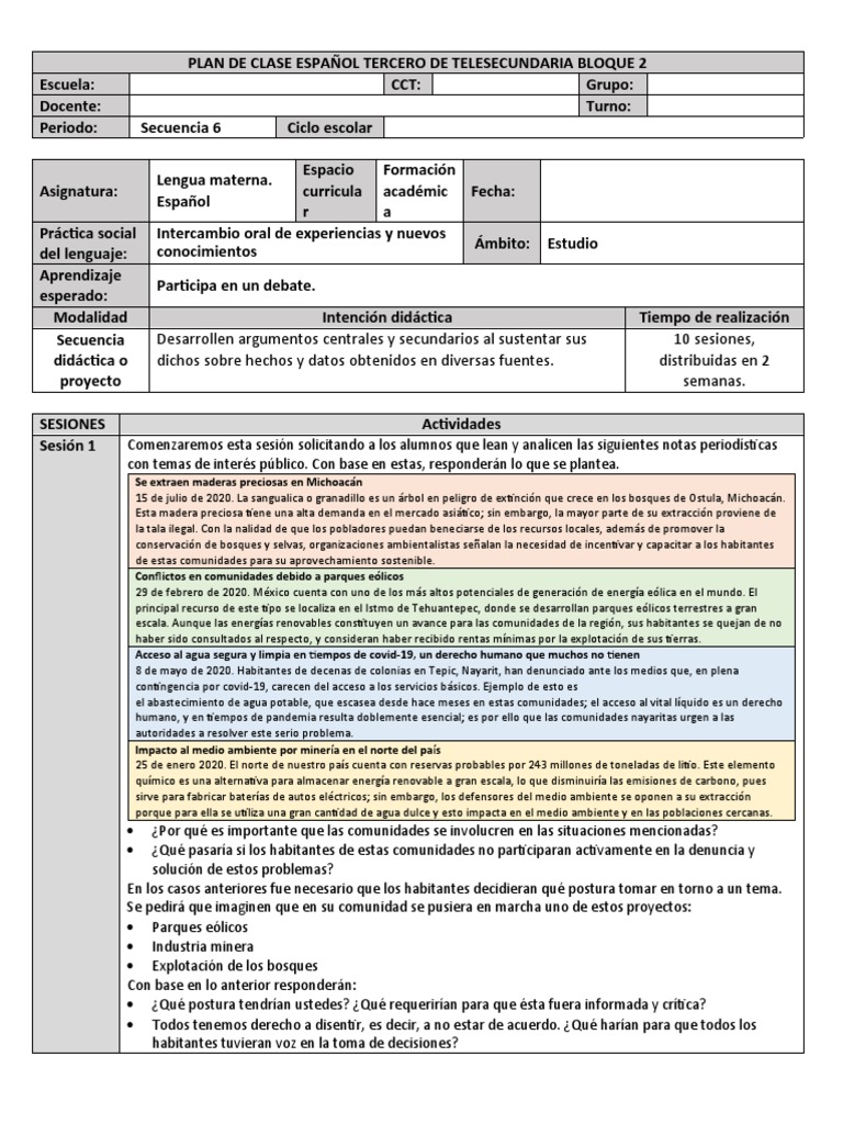PLAN DE CLASE ESPAÑOL TERCERO DE TELESECUNDARIA BLOQUE 2
