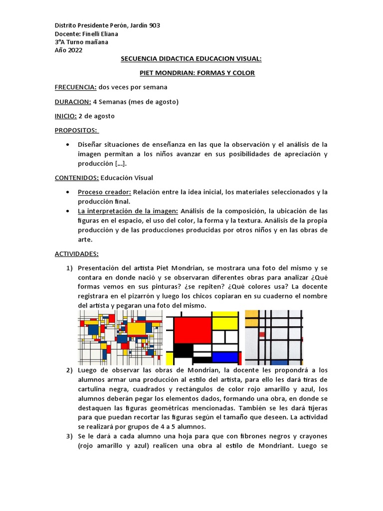 2) Luego de observar las obras de Mondrian, la docente les propondrá a los