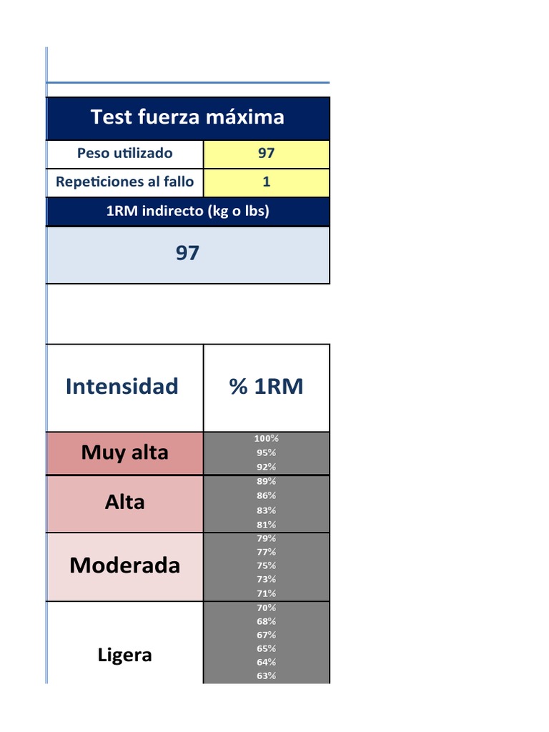o F-v (relación %1RM - velocidad), sustituye las celdas naranjas de la tabla anterior