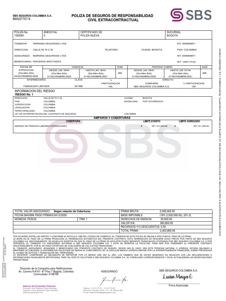 Asegurado (s) WARNING SEGURIDAD LTDA NIT830.084.867-1