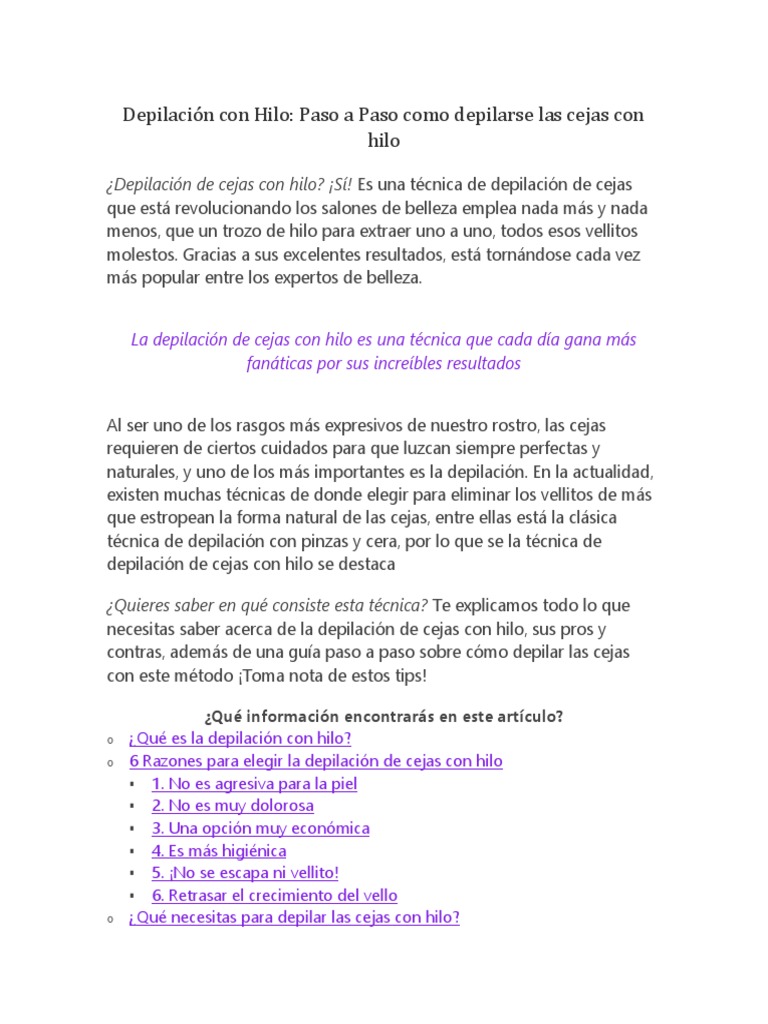 piel. Como su nombre lo indica, la depilación cejas con hilo emplea hilo