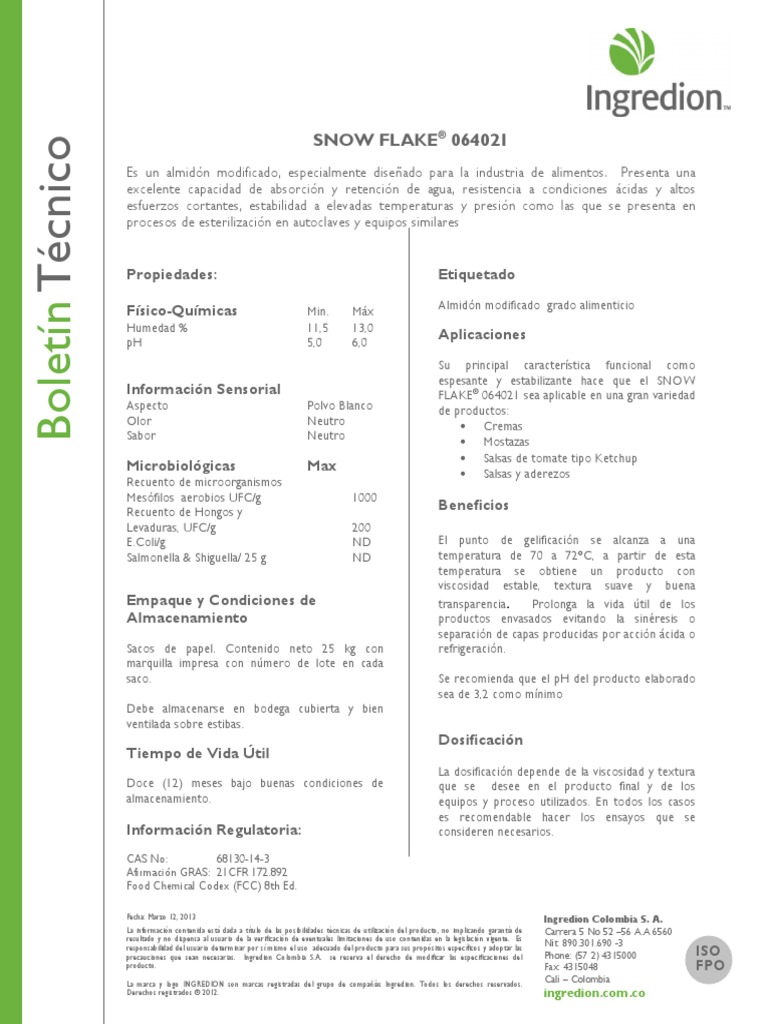 precauciones que sean necesarias. Ingredion Colombia S.A. se reserva el derecho de modificar las especificaciones del Phone: (57 2) 4315000 ISO