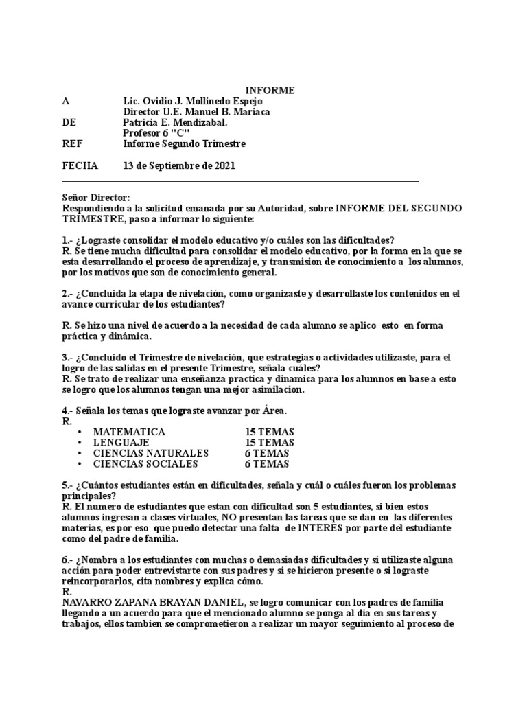 Respondiendo a la solicitud emanada por su Autoridad, sobre INFORME DEL SEGUNDO
