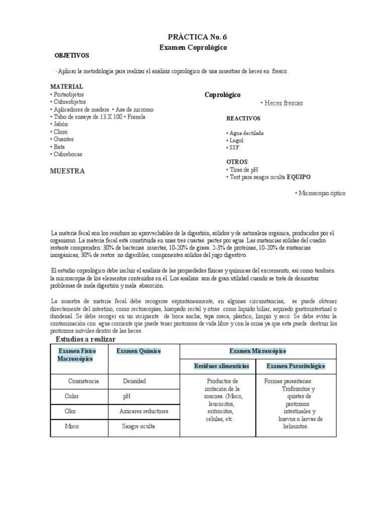 El estudio coprológico debe incluir el análisis de las propiedades físicas y químicas del excremento, así como también